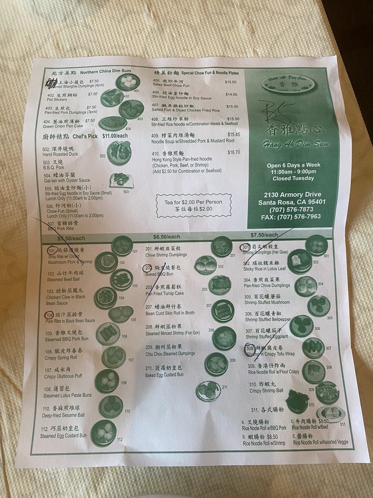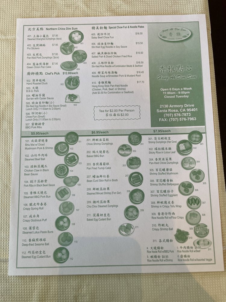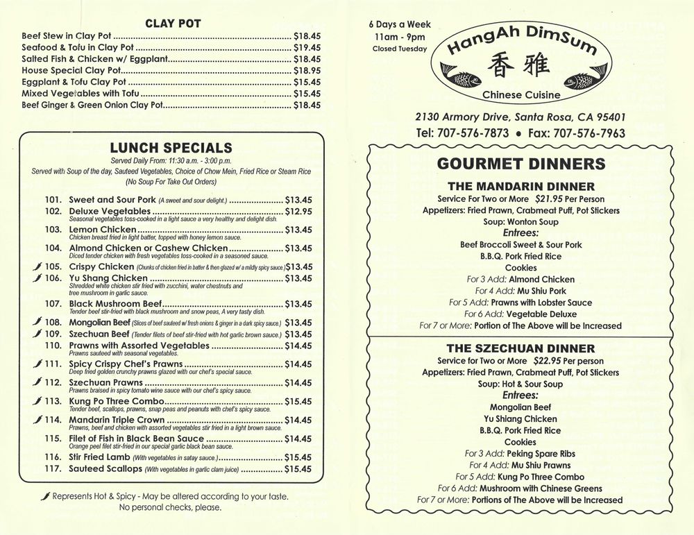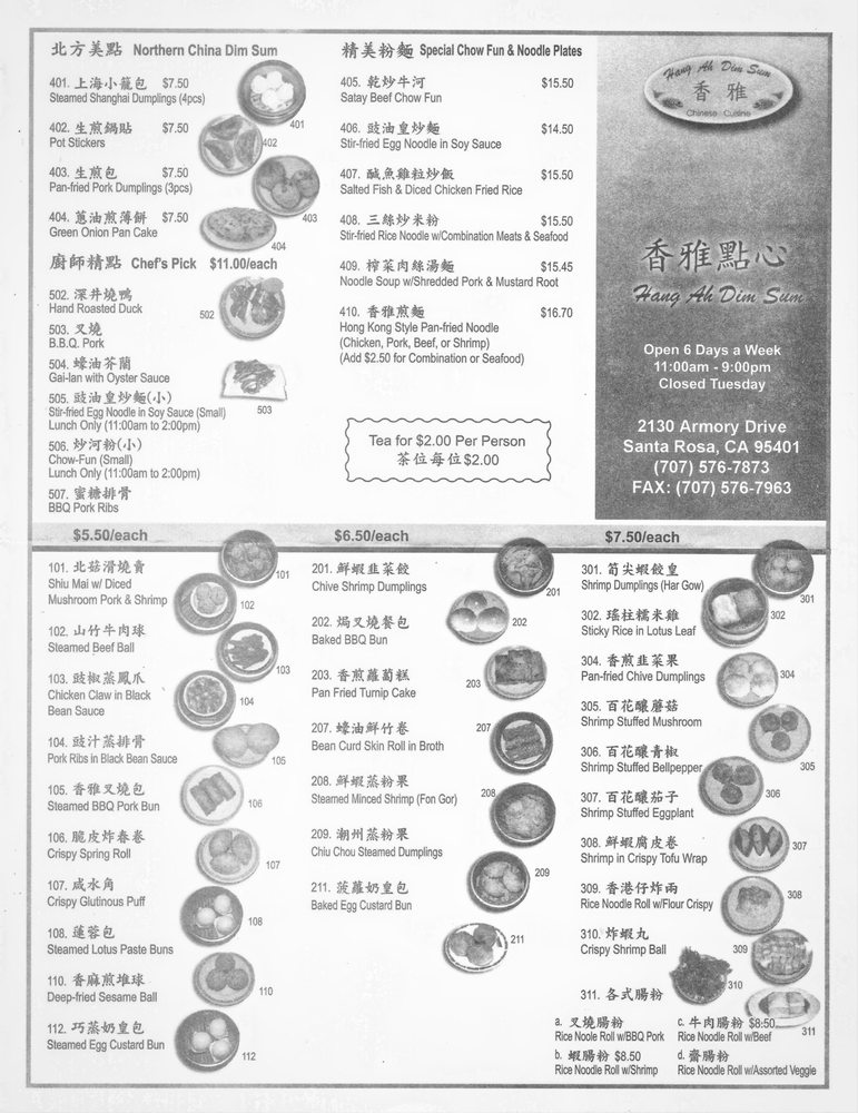 Hang Ah Dim Sum, located in Santa Rosa, offers a diverse menu of authentic Hong Kong dim sum and American Chinese dishes. The casual restaurant provides quick service, making it ideal for a sit-down lunch. Customers praise the lunch specials, with options like hot and sour soup followed by generous entrees. The food is consistently hot, fresh, and flavorful, with favorites including the Kung Po 3 combo and chive dumplings. While some have noted skimpy portion sizes, overall, Hang Ah Dim Sum delivers quality dishes at reasonable prices. With a focus on traditional dim sum items like Steamed Shanghai Dumplings and Pot Stickers, this restaurant stands out for its authentic flavors and attentive service. Enhance your dining experience with the diverse culinary offerings at Hang Ah Dim Sum.